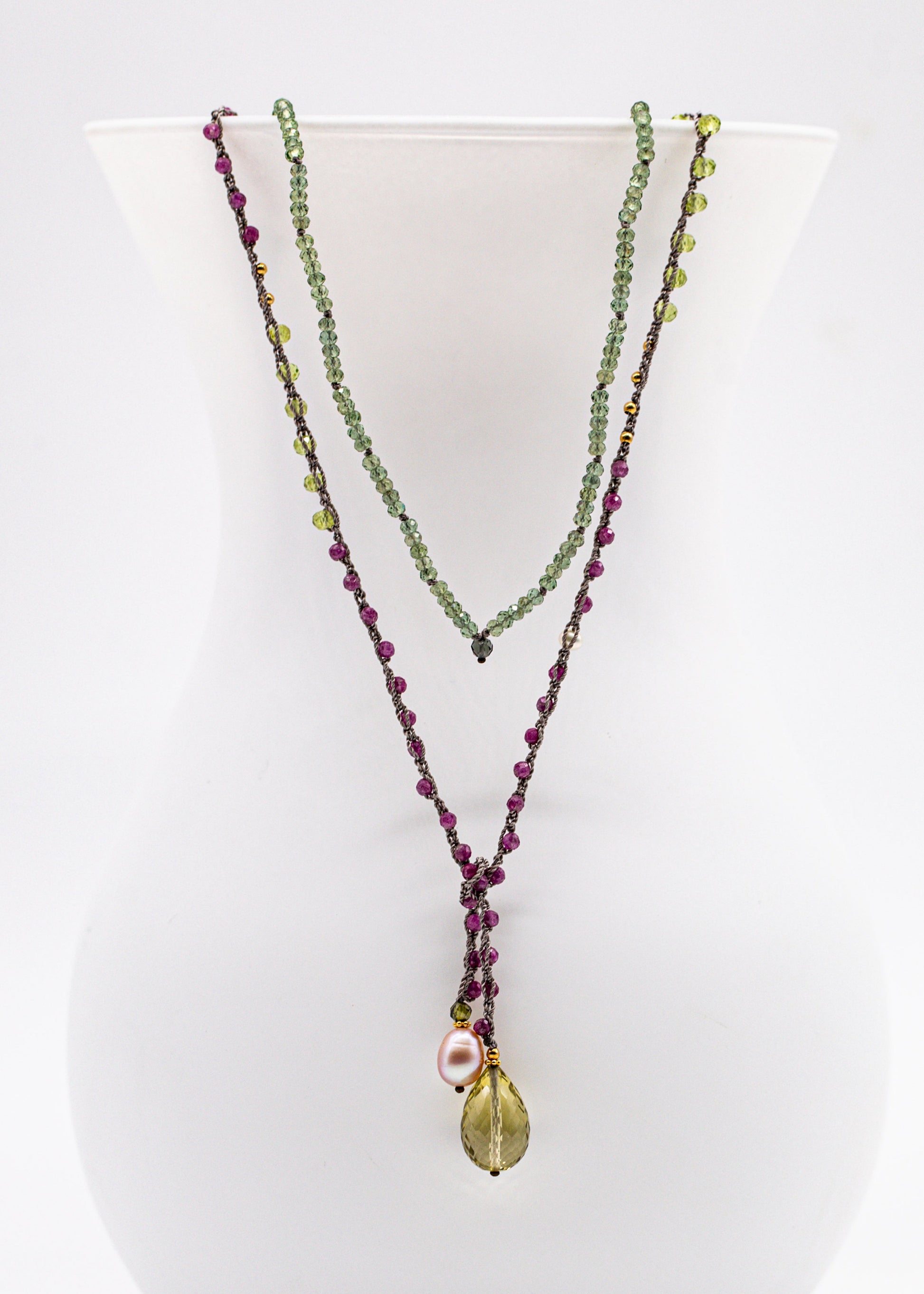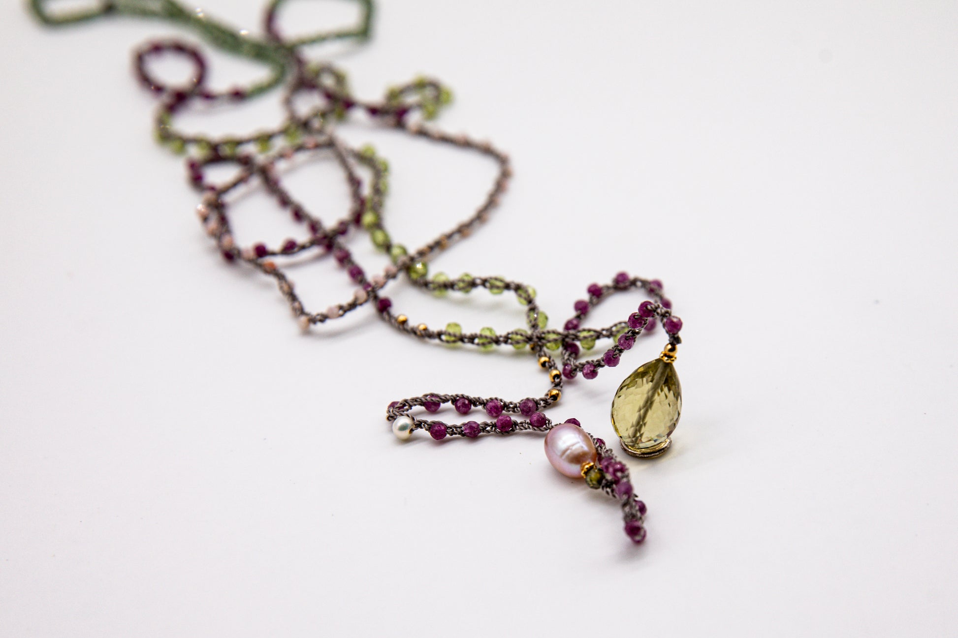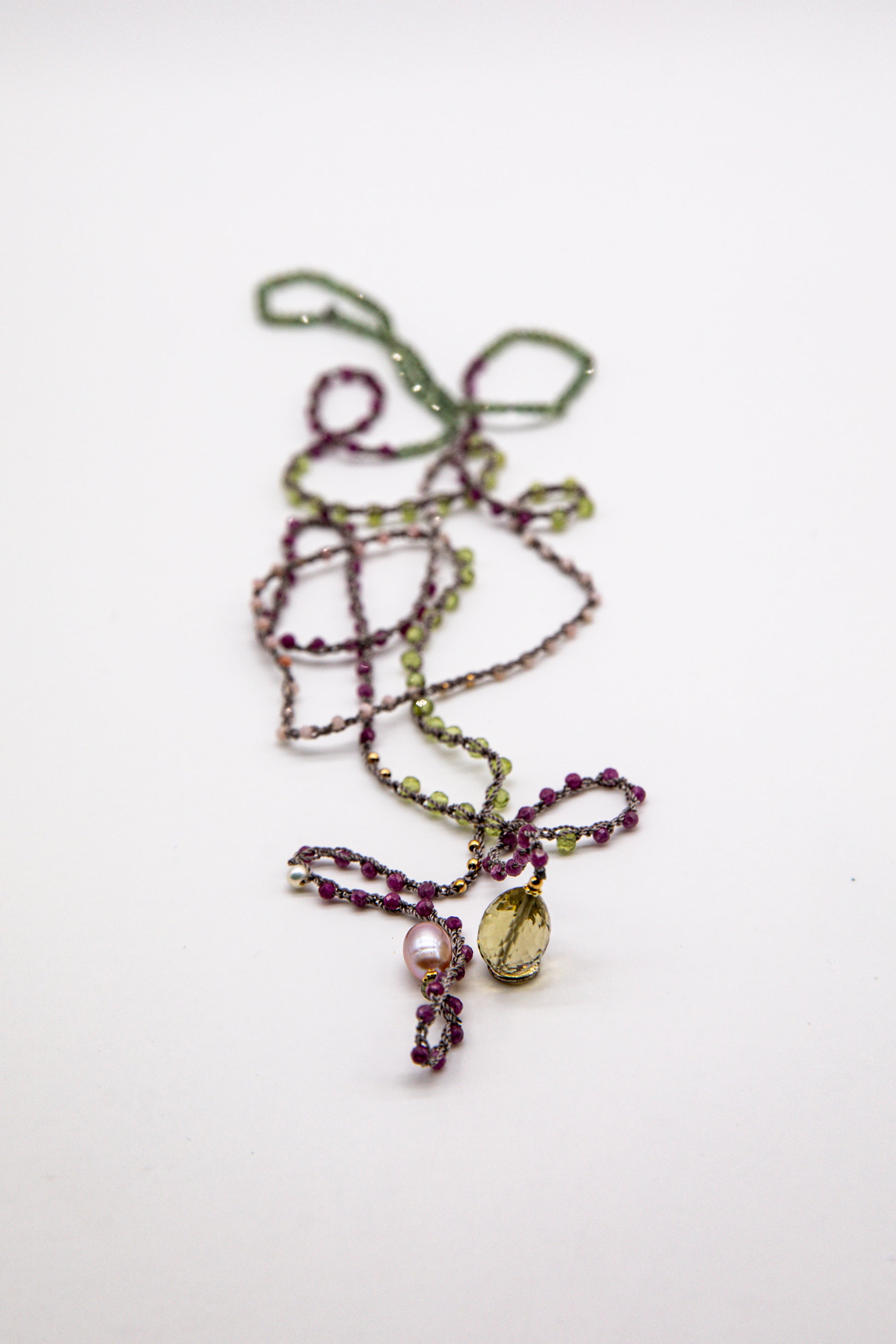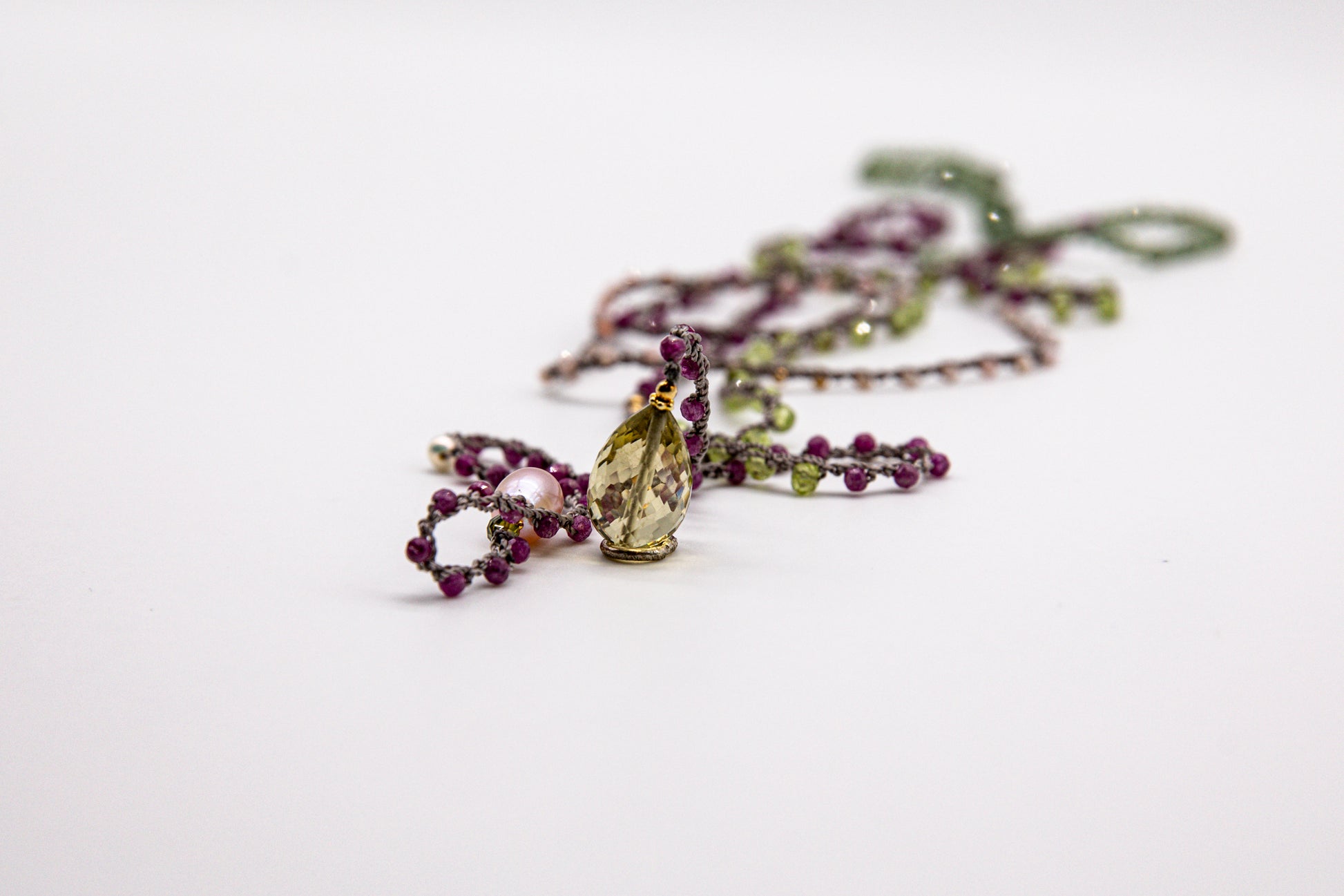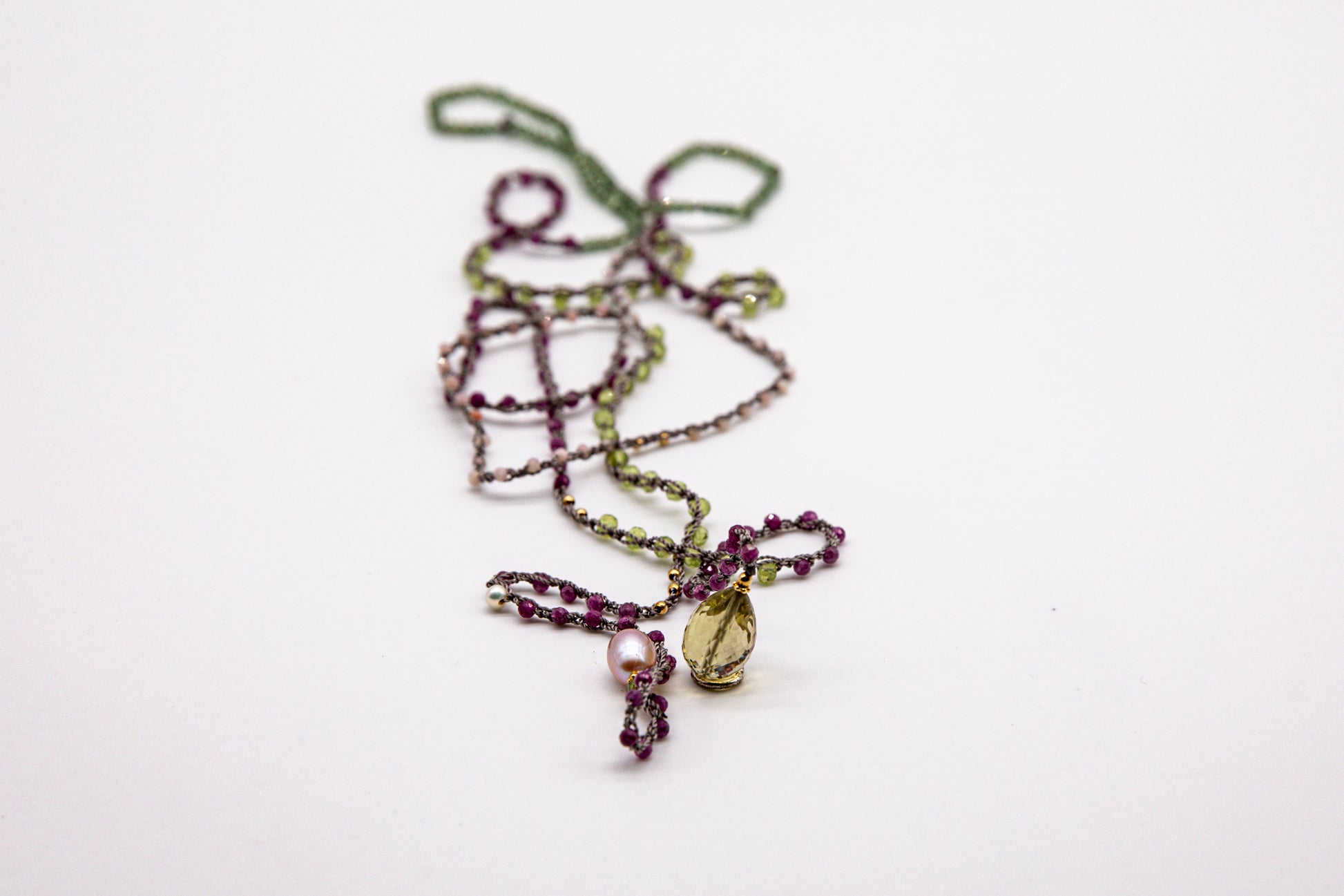 Diese edle, handgefertigte Kette vereint die strahlende Tiefe des Rubins mit der sanften Transparenz von grünem Amethyst und dem schimmernden Mondstein. Funkelnder Zirkonia sorgt für zusätzliche Highlights. Ein leuchtender Citrin und eine Süßwasserperle an den Enden setzen elegante Akzente. Dank der offenen Gestaltung kann die Kette in verschiedenen Längen getragen und individuell gebunden werden – perfekt für vielseitige Looks.