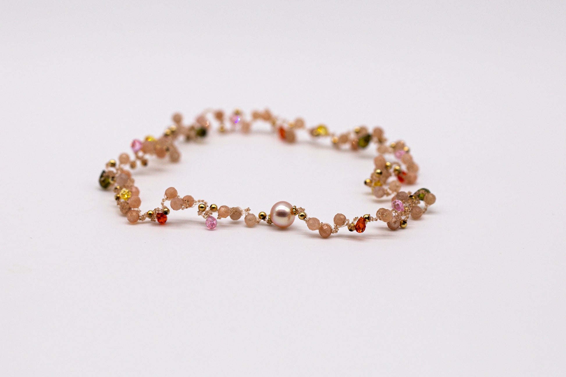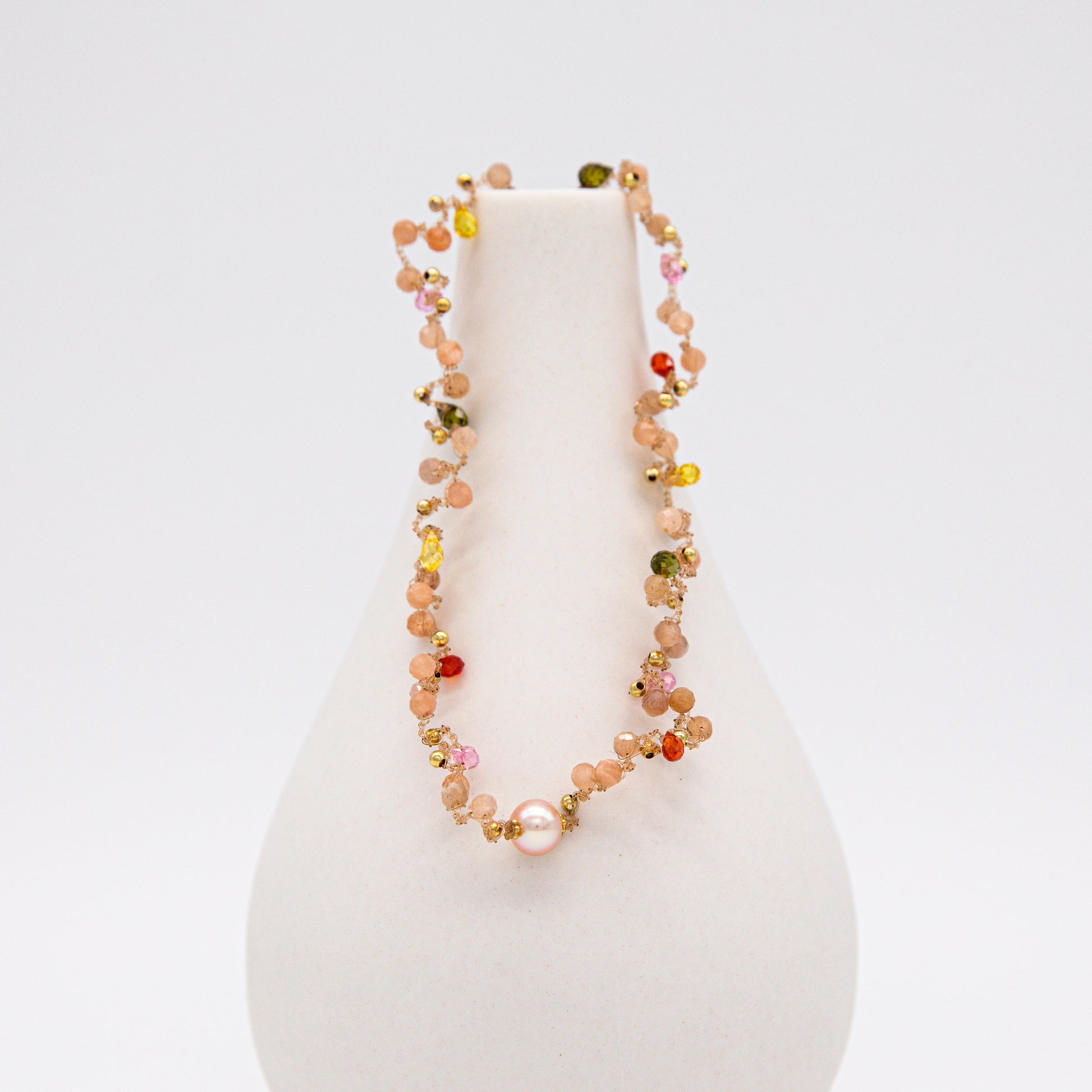 Enise verbindet Licht und Farbe auf sanfte Weise. Schimmernder Mondstein trifft auf kleine, bunte Zirkonia, die in zarten Tönen funkeln – dezent, aber lebendig. Vergoldete Silberperlen bringen warme Akzente ins Spiel, während eine einzelne Süßwasserperle dem Design Ruhe und Eleganz verleiht.