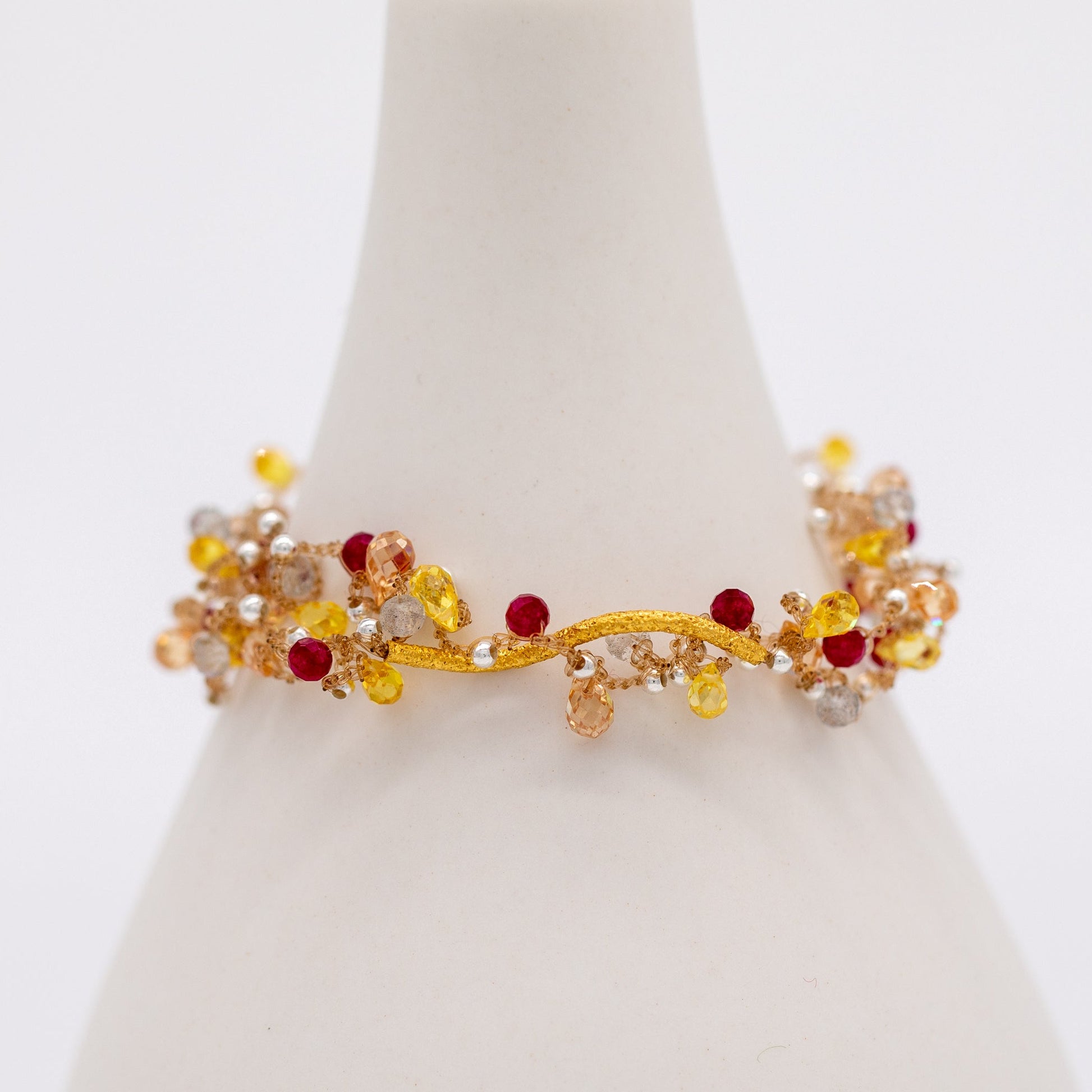 Diese Kette kombiniert Rubin, Zirkonia, Silberperlen, Labradorith und vergoldetes Silber zu einem schlichten, eleganten Design. Die rubinroten Steine bringen eine sanfte Farbtiefe, während der Labradorith mit seinem Glanz interessante Akzente setzt. Die Zirkoniasteine fügen einen Funkel-Effekt hinzu, und die Silberperlen sowie die vergoldeten Silberelemente runden das Gesamtbild harmonisch ab.