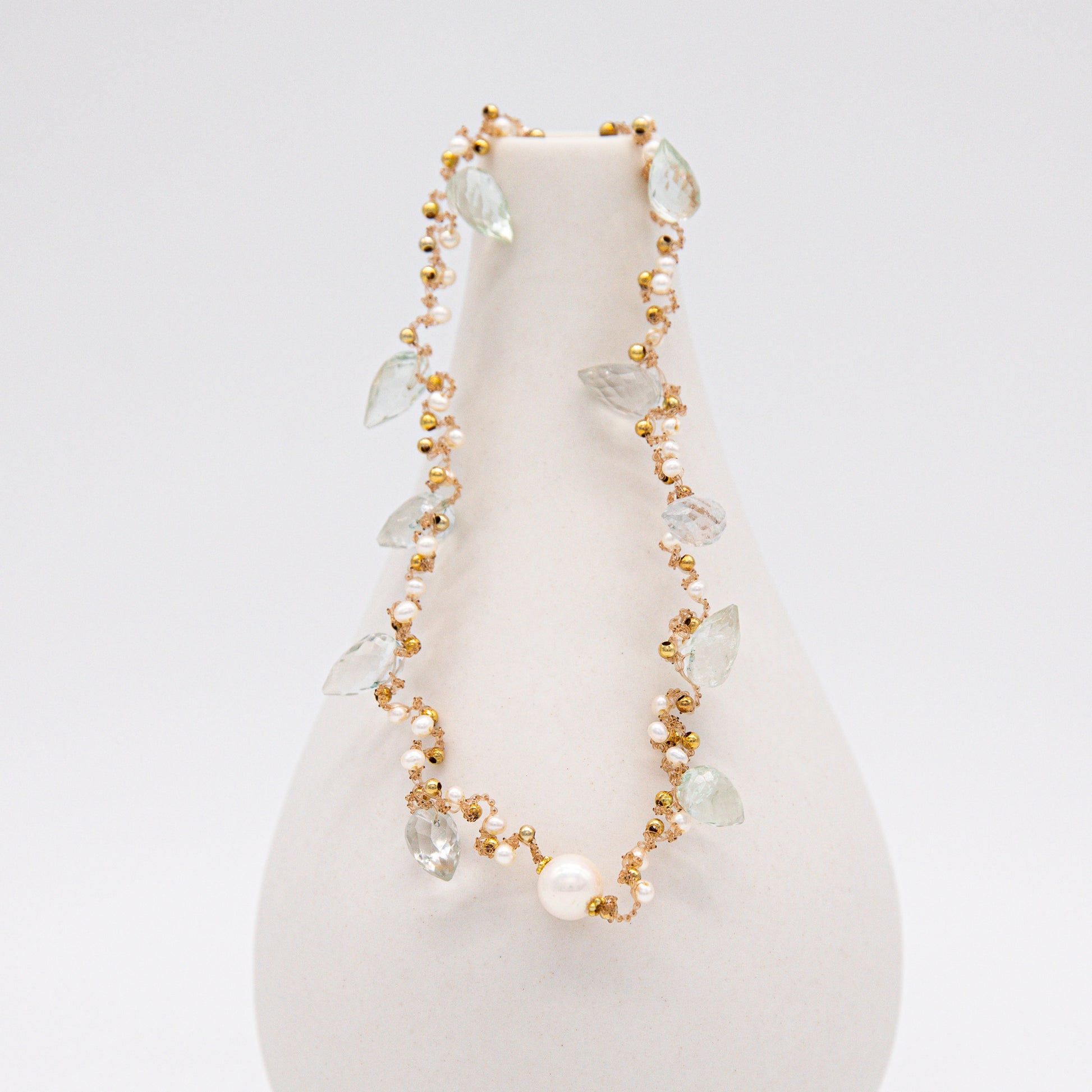 Als Halskette getragen, schmiegt sich das gehäkelte Band sanft an die Haut und setzt die Edelsteine dezent in Szene. Die elastische Verarbeitung sorgt für hohen Tragekomfort, während das minimalistische Design vielseitig kombinierbar bleibt – ob zum schlichten Top, luftigen Kleid oder eleganten Abend-Look. Jede Kette bringt ihre eigene Ausstrahlung mit und lässt sich solo oder im Layering perfekt in deinen persönlichen