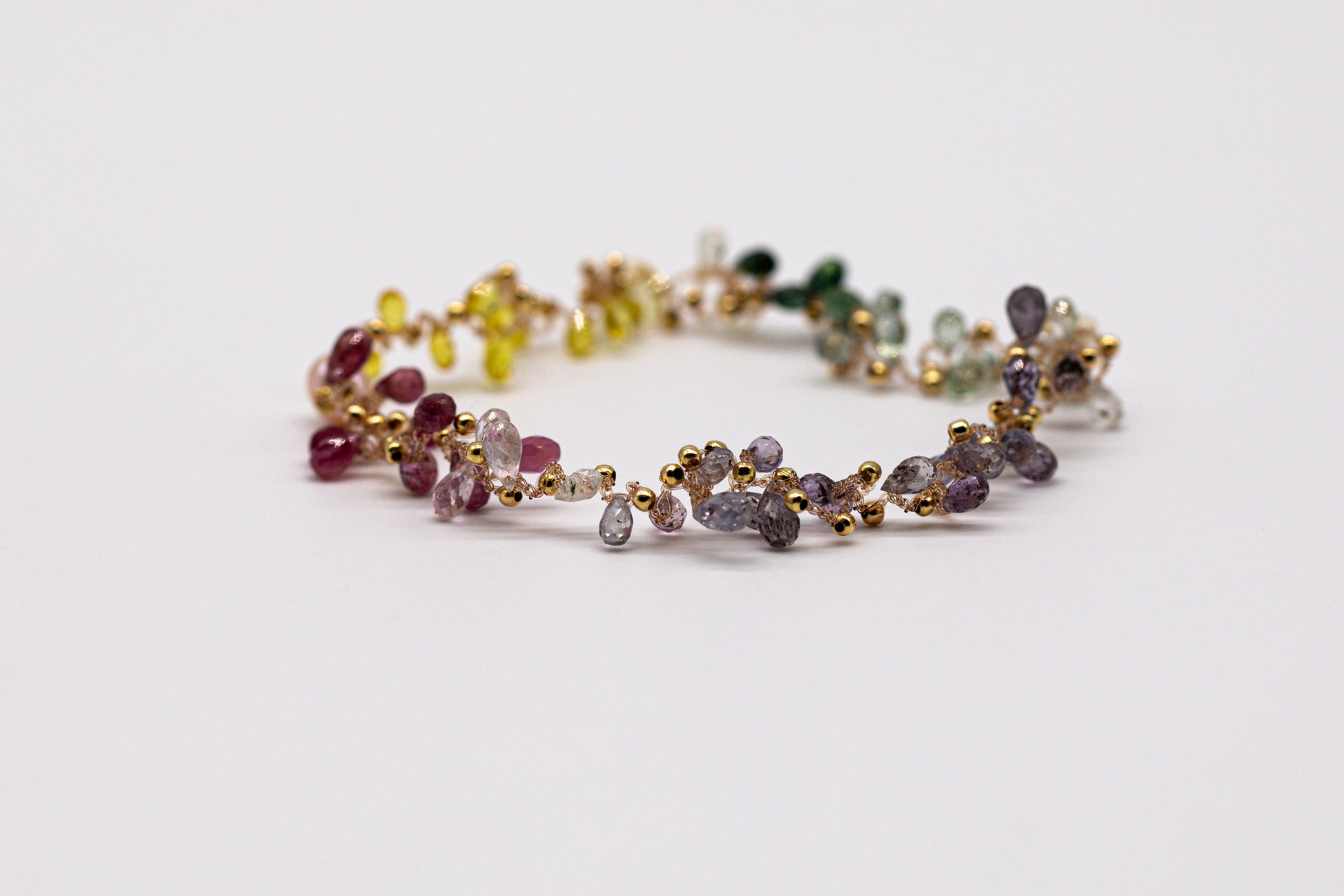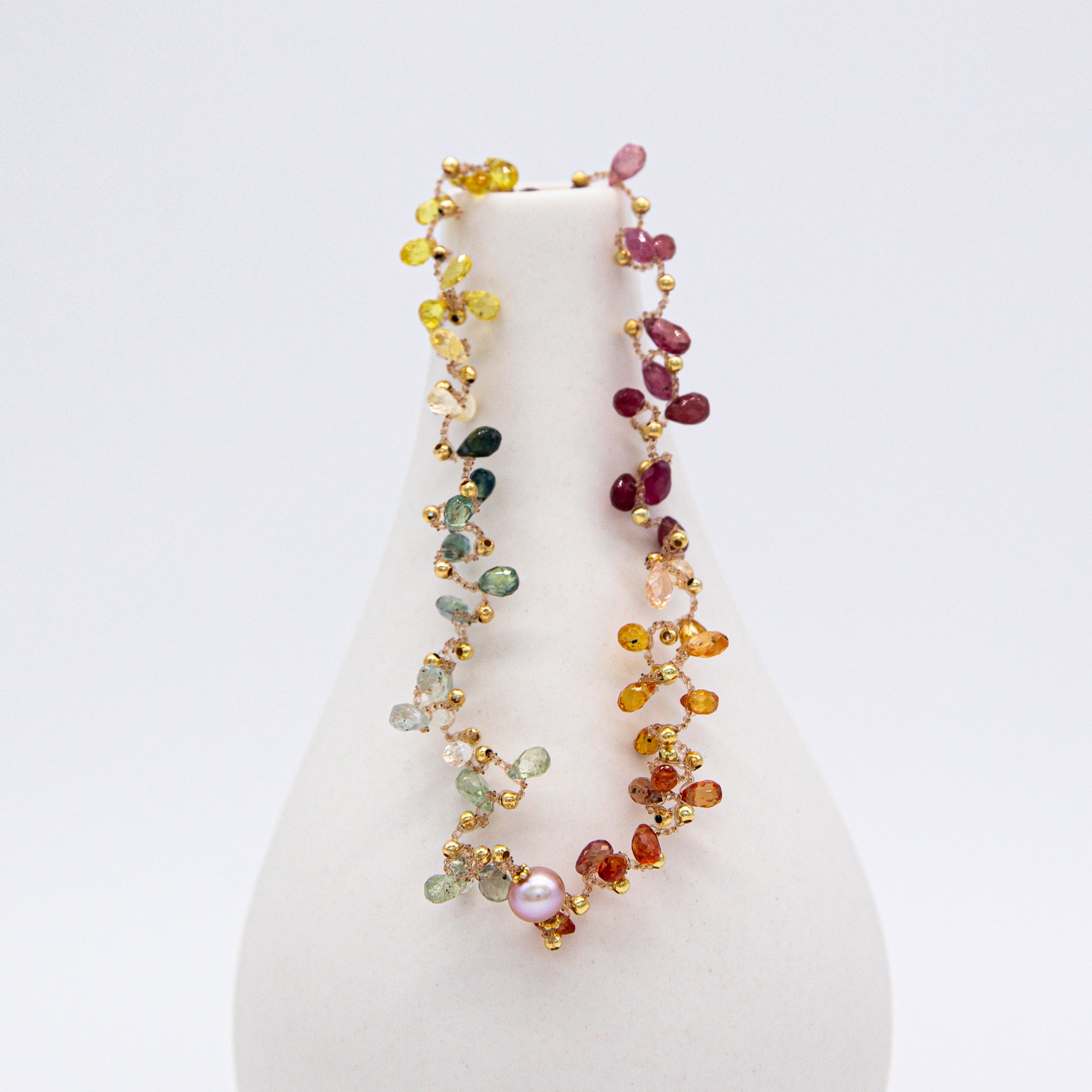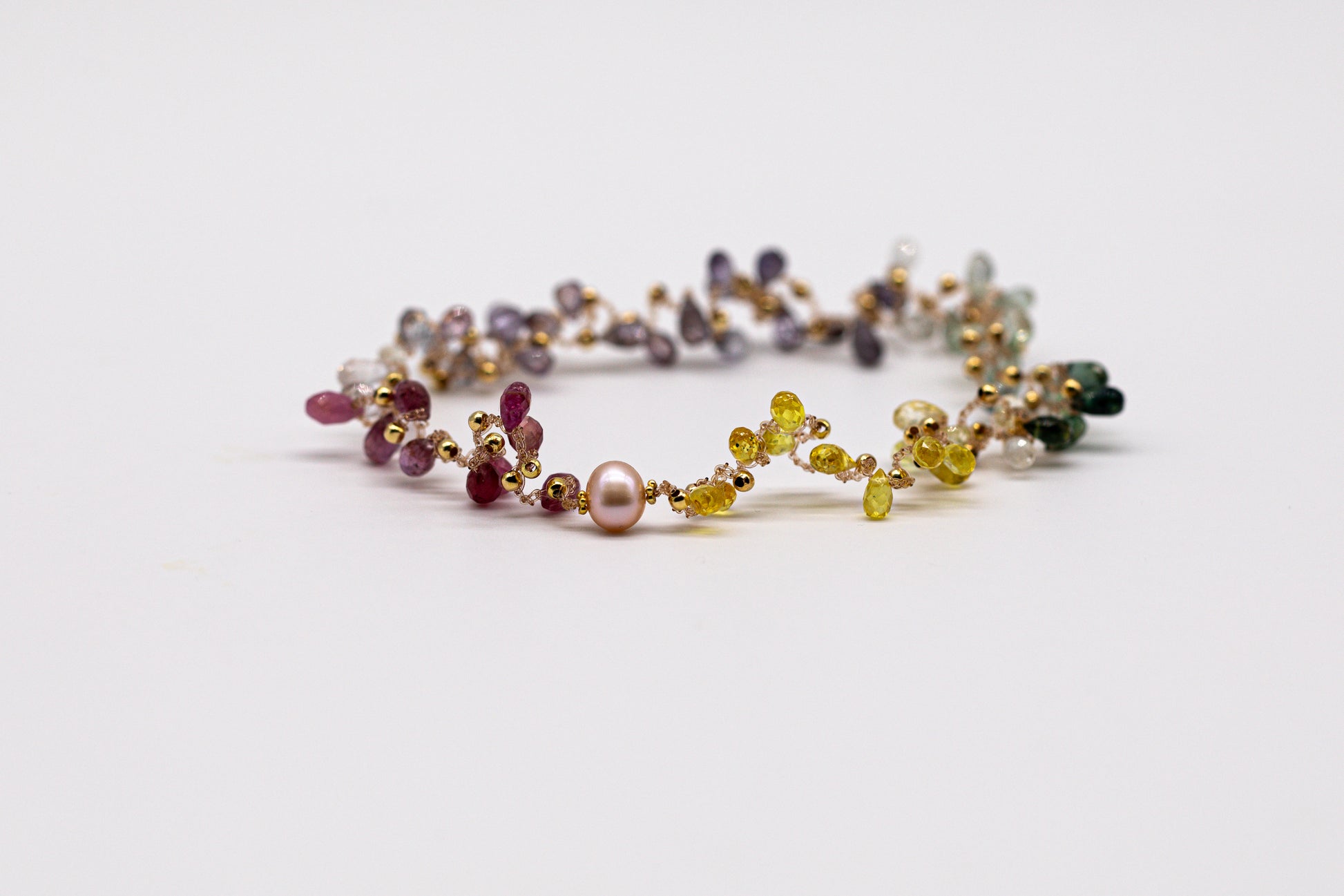 Zina ist ein feiner Farbtraum – lebendig, aber niemals laut. Kleine, bunte Saphire in harmonischen Naturtönen schimmern sanft und bringen Leichtigkeit ins Design. Eine einzelne Süßwasserperle fügt sich elegant ein, während vergoldetes Silber feine Lichtpunkte setzt.